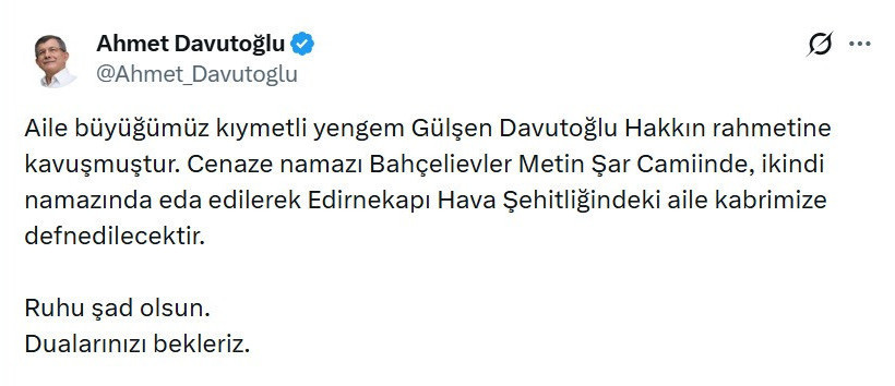 “Aile büyüğümüz kıymetli yengem Gülşen Davutoğlu Hakkın rahmetine kavuşmuştur. Cenaze namazı Bahçelievler Metin Şar Camiinde, ikindi namazında eda edilerek Edirnekapı Hava Şehitliğindeki aile kabrimize defnedilecektir. Ruhu şad olsun. Dualarınızı bekleriz.”
