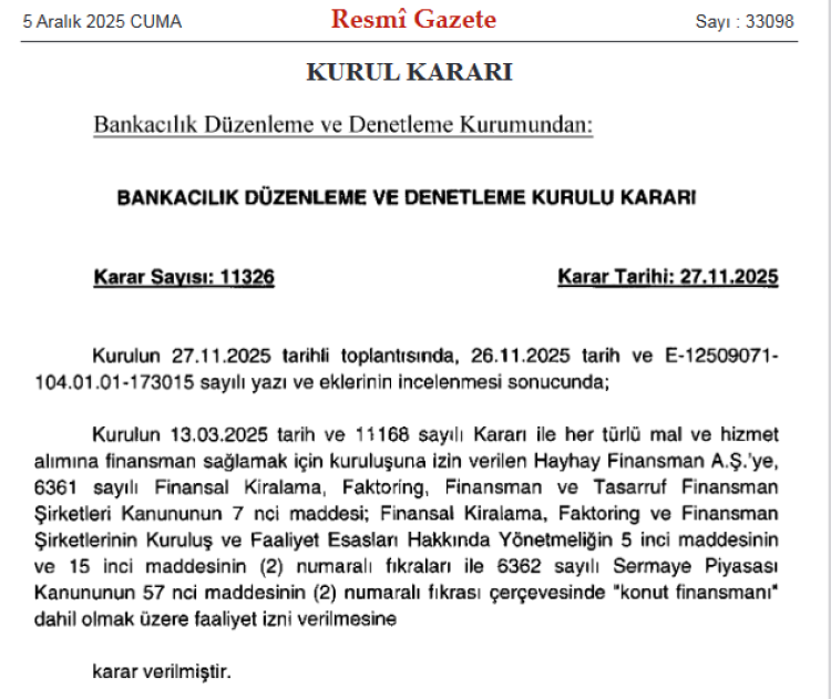Bankacılık Düzenleme ve Denetleme Kurulu (BDDK), 27 Kasım 2025 tarihli 11326 sayılı kararıyla Hayhay Finansman A.Ş.’ye faaliyet izni verdi. Resmi Gazete’de yayımlanan karar, şirketin konut finansmanı dahil her türlü mal ve hizmet alımı için kredi sağlayabilmesini resmileştirdi. Finans sektörüne yeni bir oyuncu eklendi.